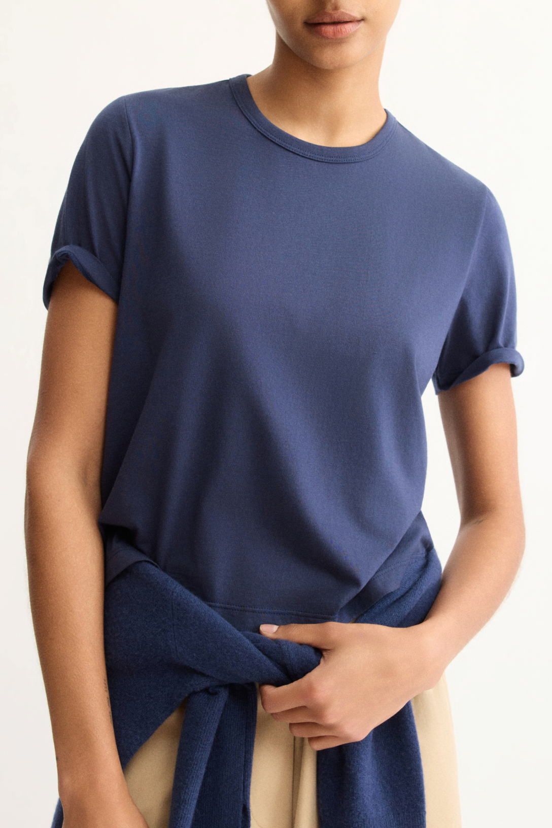 This is the perfect everyday tee with a boxy fit and bicep-grazing sleeve. Layer it under all your sweaters and cardigans on chilly days and on its own once it warms up.